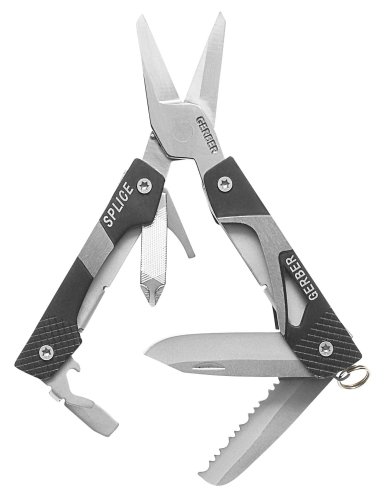Key Features Butterfly opening scissors Fits on a keychainProduct Description:The Gerber Splice Mini Tool is small enough to fit on your keychain, yet it is still 9 tools in one. This Gerber 30-000014 model is black stainless steel constrauction and has butterfly opening scissors, small and large flathead screwdrivers, crosspoint screwdriver, bottle opener, file, a fine edge blade, and a serrated blade.Technical Specs: Overall Length: 4 inches Closed Length: 2.4 inches Width Opened: 3.5 inches Width Closed: 1 inch Blade Length: 1.5 inches Weight: 2.5 oz. Stainless steel constructionCustomer Reviews